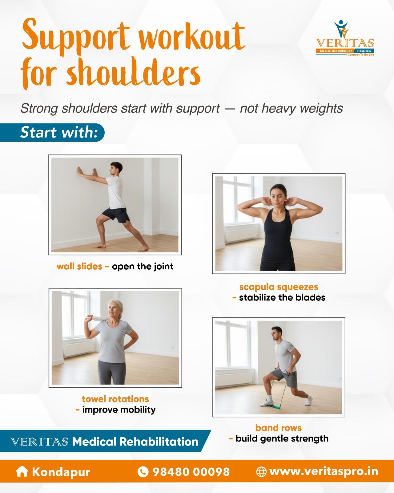 #VeritasRehabAndHospitals #VeritasRehab #RehabInKondapur #BestRehabCentresInHyderabad #ShoulderRehab #PhysiotherapyCare #ScapularStability #ShoulderStrength #MobilityRestoration #PainFreeMovement #RehabExercises #HydRehab #PatientFirstCareSupport workouts for shoulder stability & strength Wall slides – improve shoulder mobility & control Scapula squeezes – activate upper back for better posture Band rows – strengthen shoulder and back muscles safely Towel rotations – support gentle rotation & flexibility At Veritas Rehab and Hospitals in Kondapur, these exercises are guided by rehab experts to support shoulder recovery, reduce strain, and improve long-term movement quality 💙 Recognised as one of the best rehab centres in Hyderabad, Veritas focuses on safe, progressive rehabilitation tailored to individual needs. Start your recovery with expert care Website: https://veritashospitals.com/ Call: 098480 00098 #VeritasRehabAndHospitals #VeritasRehab #RehabInKondapur #BestRehabCentresInHyderabad #ShoulderRehab #PhysiotherapyCare #ScapularStability #ShoulderStrength #MobilityRestoration #PainFreeMovement #RehabExercises #HydRehab #PatientFirstCare·96 Views ·0 Reviews -