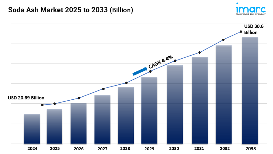 The global soda ash market size was valued at USD 20.69 billion in 2024. Looking forward, IMARC Group estimates the market to reach USD 30.6 billion by 2033, exhibiting a CAGR of 4.4% during 2025-2033.